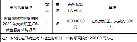江西银隆管理咨询有限公司关于南昌航空大学校医院2025年女教职工妇科普查服务采购项目(采购编号:JXYL2025-B0611)公开比选采购公告